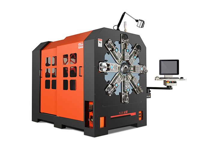 无凸轮弹簧机在国内的应用,在近几年间逐渐得到认可。与传统带凸轮电脑弹簧机相比,无凸轮弹簧机在设计上采用独特的无凸轮和无摇臂技术,其中刀架采用八组伺服马机完成驱动控制,调试过程中节省了排凸轮片的时间,而且更方便多角度弹簧产品成形,具有调试方便、加工能力强和成形速度快等特点。